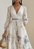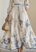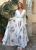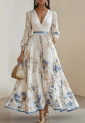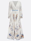 Pleated Chiffon V Neck Floral Long Sleeve Balloon Sleeve A-Line Maxi Dress