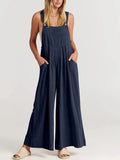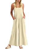 This overalls jumpsuit is designed with adjustable shoulder straps, button detailing, sleeveless style, square neckline, pockets, wide leg pants, is a loose casual fit.