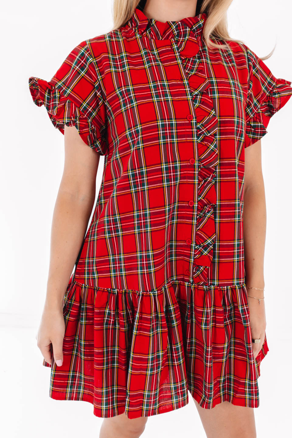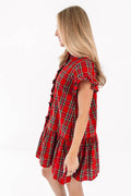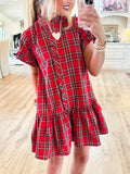 Red Plaid Mini Dress with Frilled Neckline and Button Front