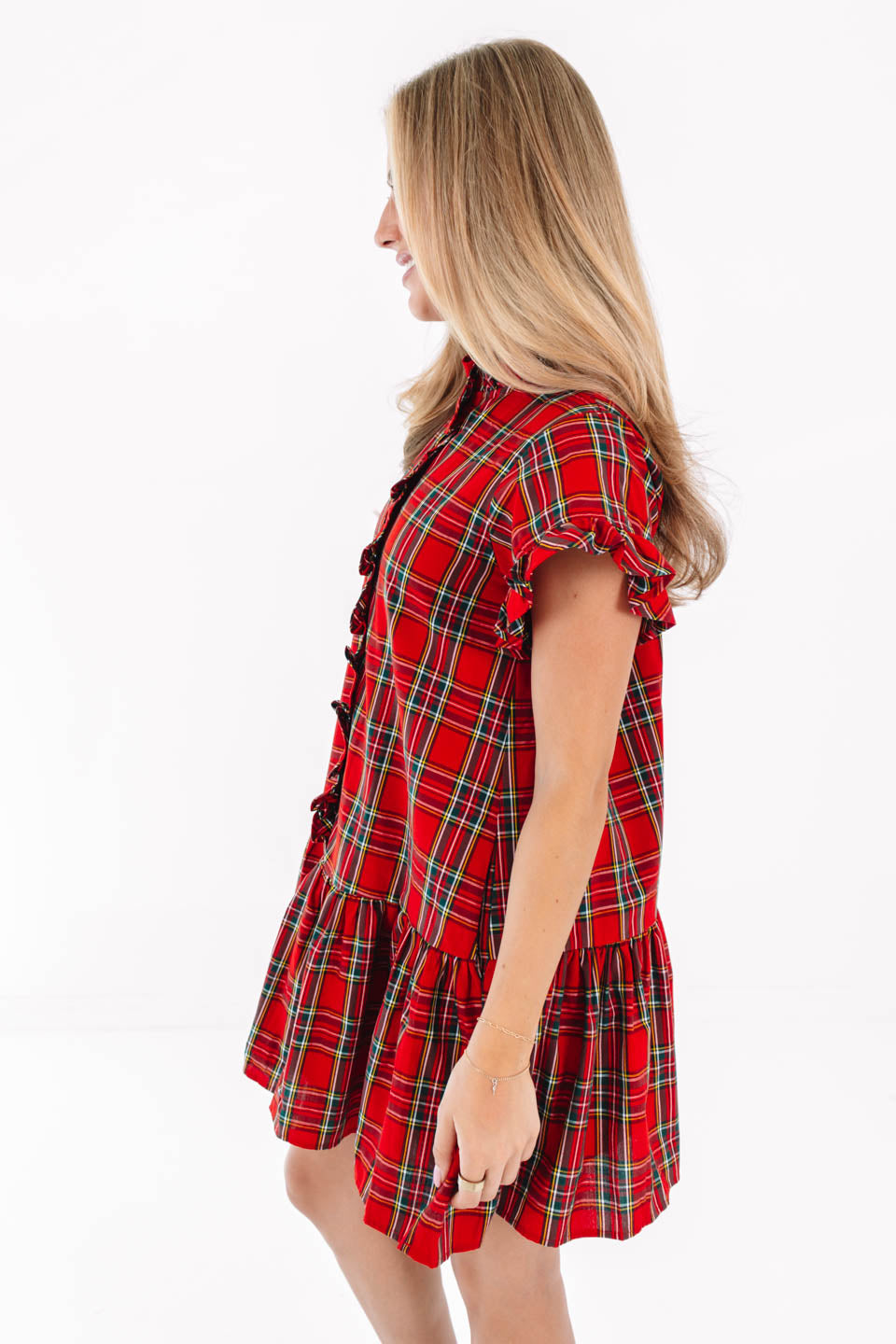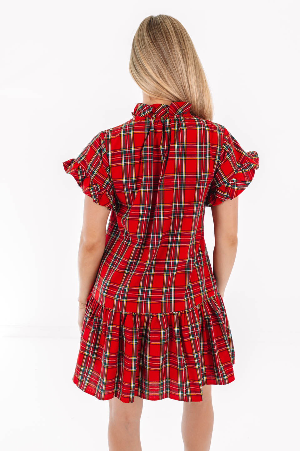 This red plaid mini dress features a frilled neckline, short sleeves, and a full button-up front. The design includes functional front pockets and is lined for comfort. It is intended for hand washing.