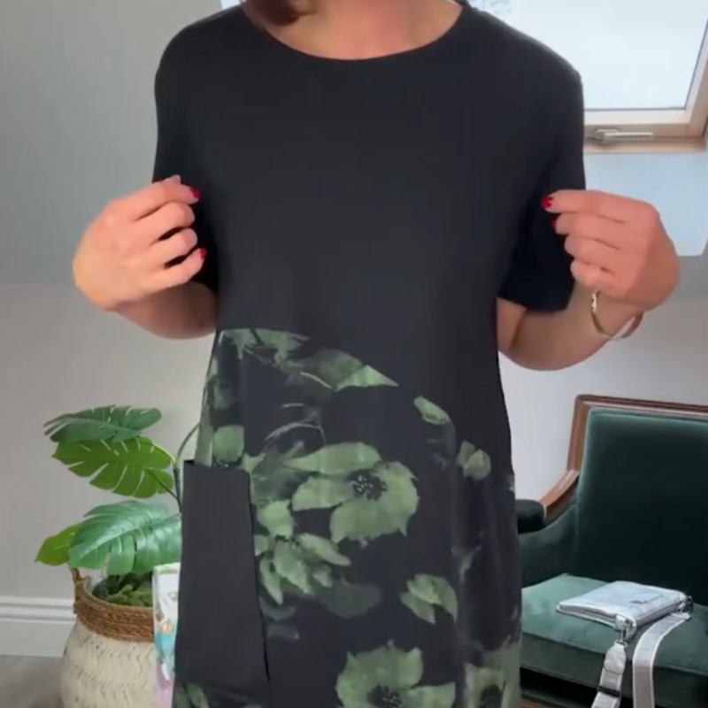 Package Included:1*Round Neck Leaf Print Dress with Pockets