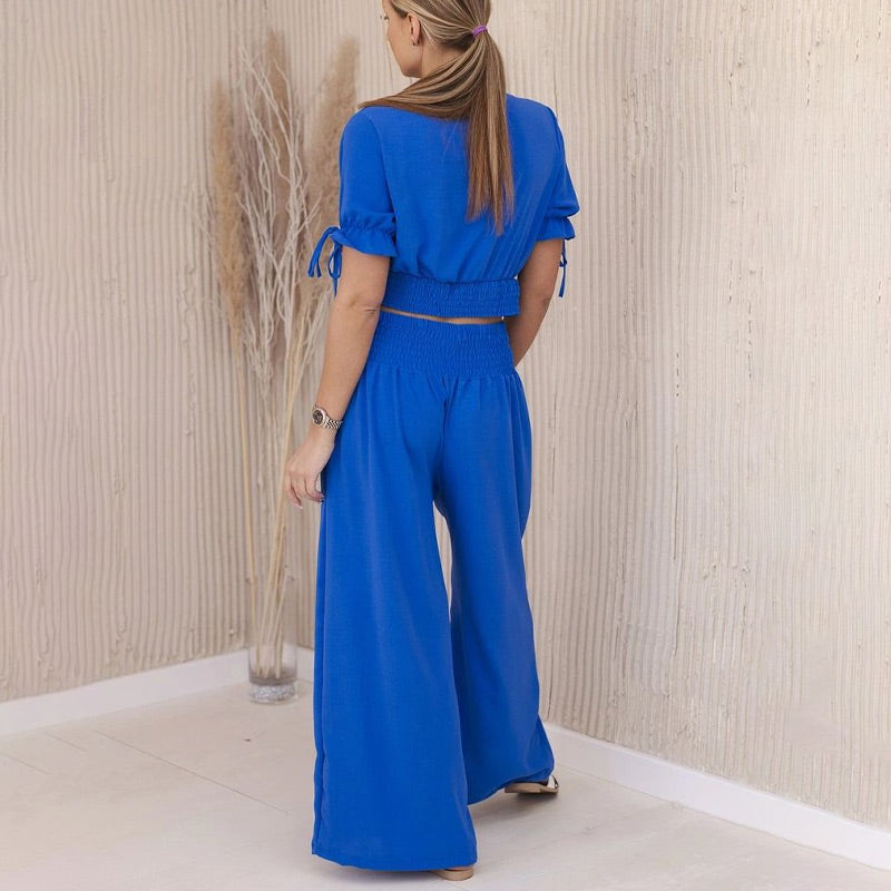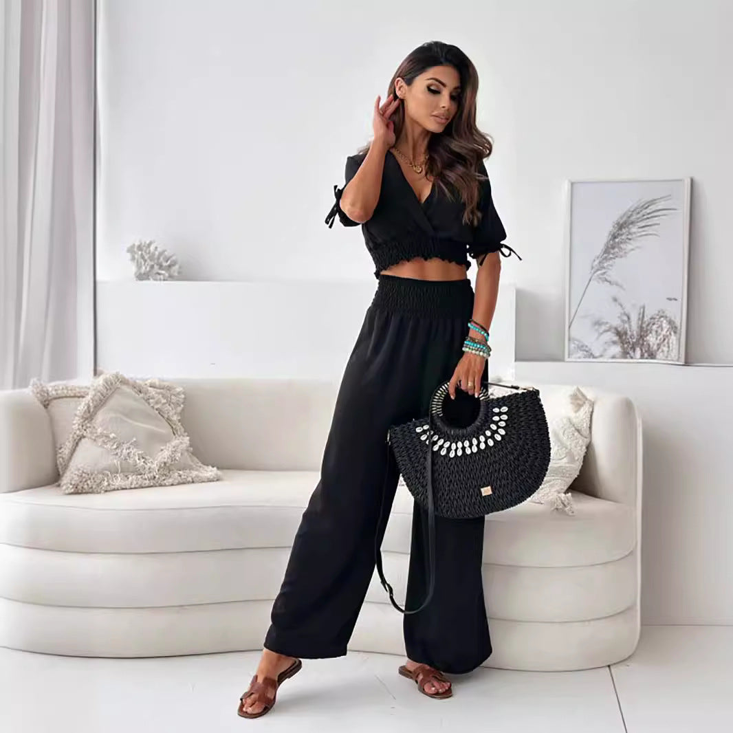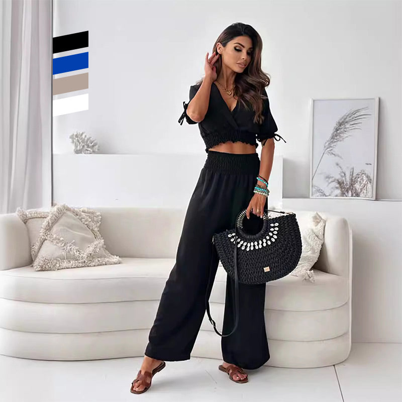Package includes: 1* 2-Piece Set: V-Neck Top, Wide Leg Pants