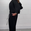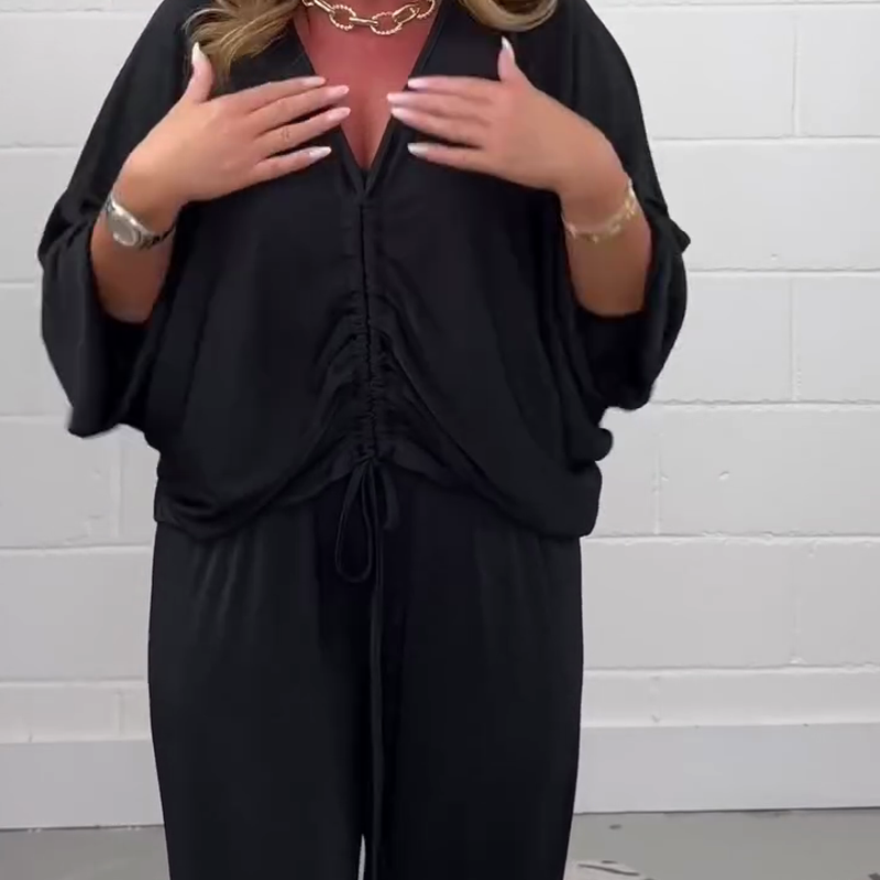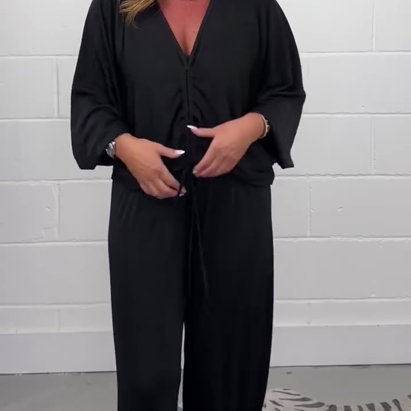 Solid Color V-Neck Drawstring Dolman Sleeves Top & Wide-Leg Pants Two-Piece Set