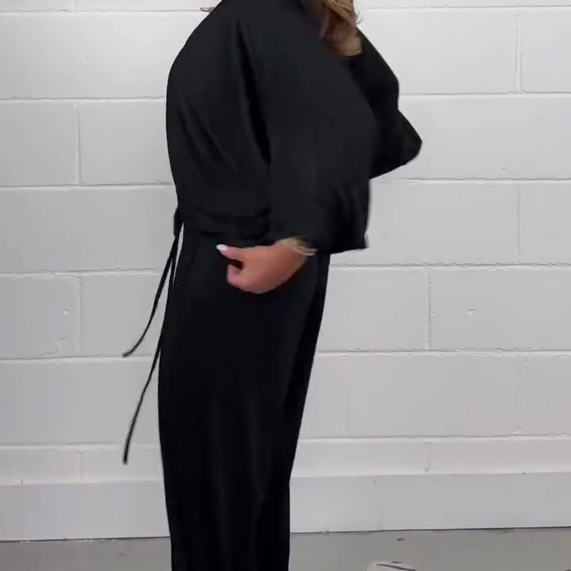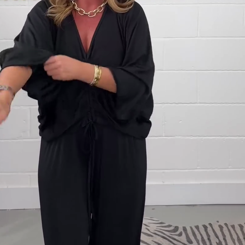 V-NECK WITH ADJUSTABLE DRAWSTRING FOR A SLIMMING, STYLISH LOOK - The top features a classic V-neck cut paired with an adjustable drawstring design. This not only flatters the neckline and facial contours but also creates a slimming waist effect, enhancing overall style and elegance.