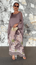 This elegant dress showcases a beautiful plant-inspired floral print, with a flattering round neck and long sleeves.