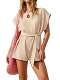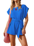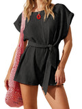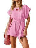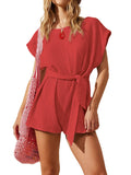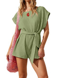 Summer Knit Casual Tie Waist Short Sleeve Jumpsuit