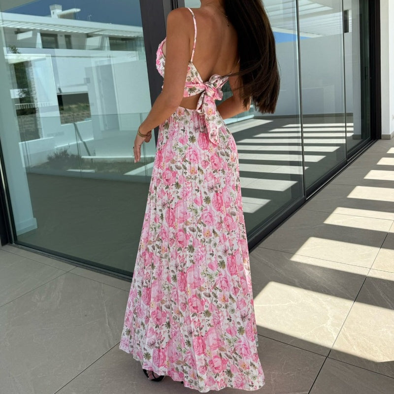 1 * Summer Sexy Backless Printed Ruched Strap Maxi Dress with Adjustable Back Tie