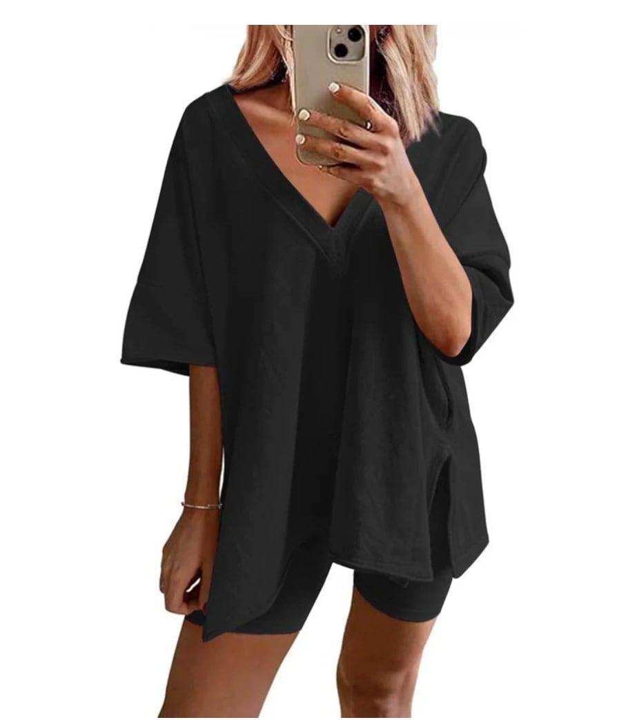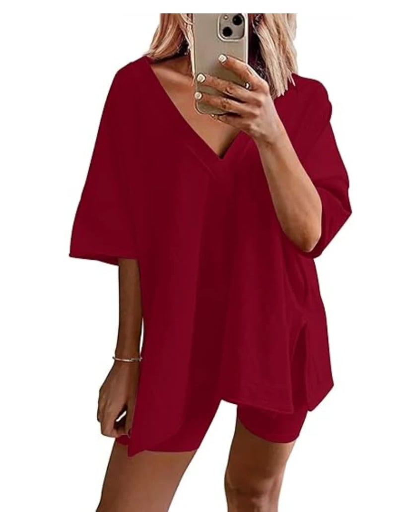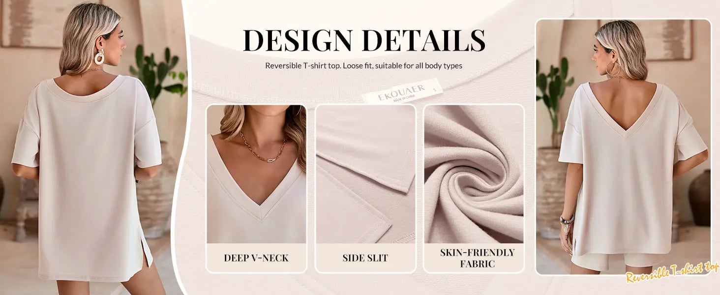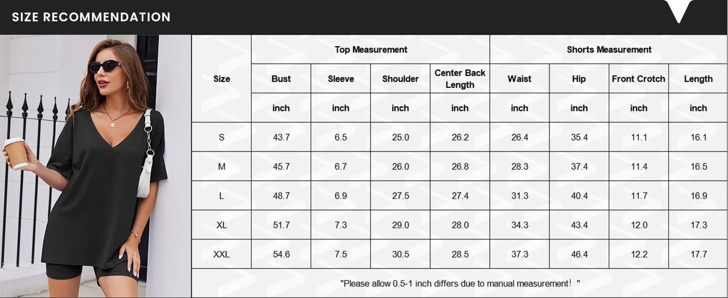 FASHION & COMFY DESIGN: 2 Piece Lounge Sets, Short sleeve oversized T-shirt, Deep V-neck, Side slit, Reversible T-shirt top. Loose fit, suitable for all body types. Matching with high waist elastic bodycon biker shorts.