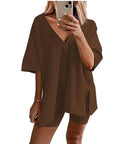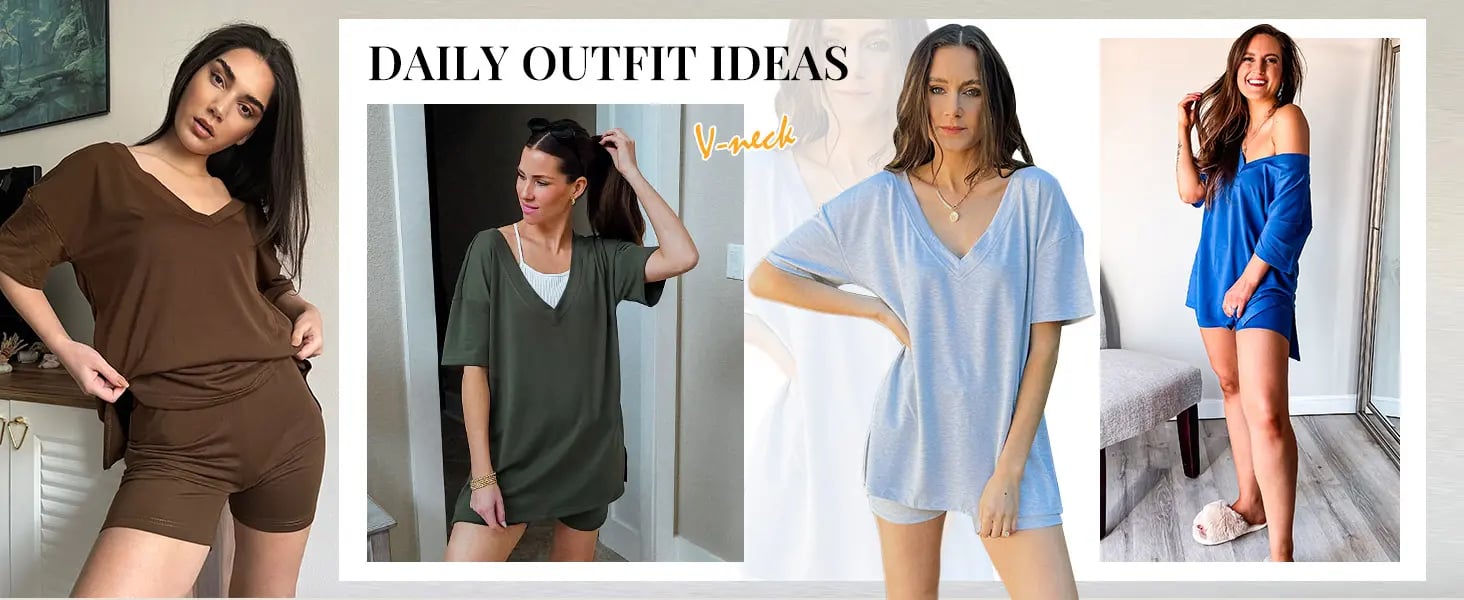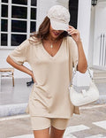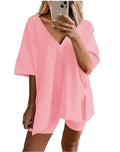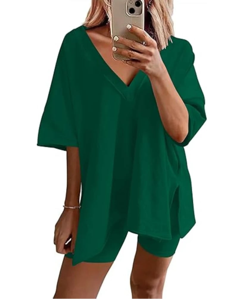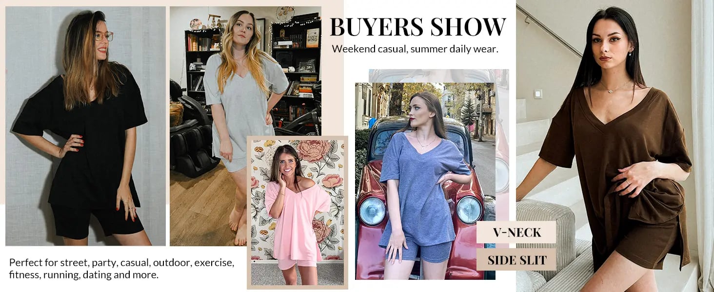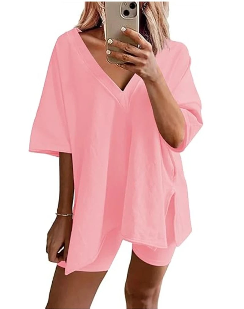 FASHION & COMFY DESIGN: 2 Piece Lounge Sets, Short sleeve oversized T-shirt, Deep V-neck, Side slit, Reversible T-shirt top. Loose fit, suitable for all body types. Matching with high waist elastic bodycon biker shorts.