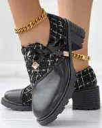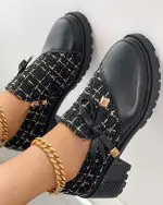 Tweed Patch Bowknot Decor Chunky Heel Loafers