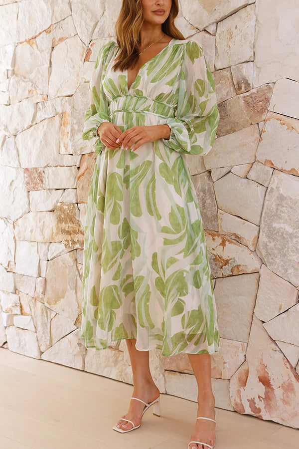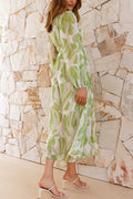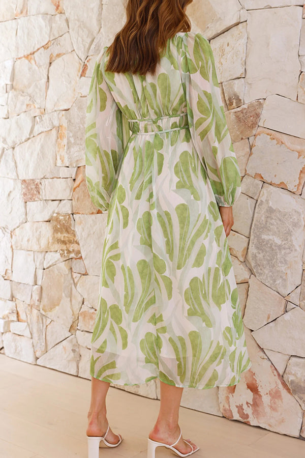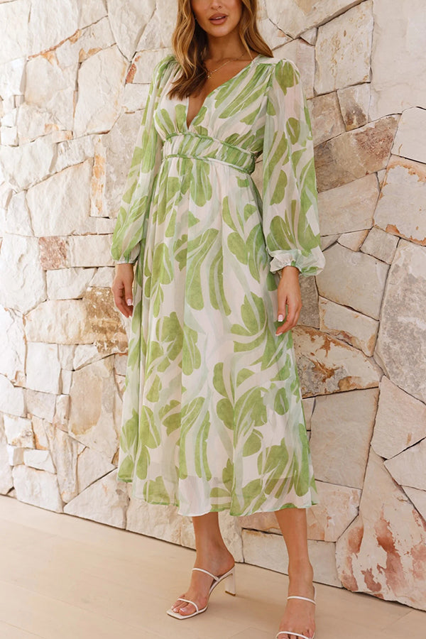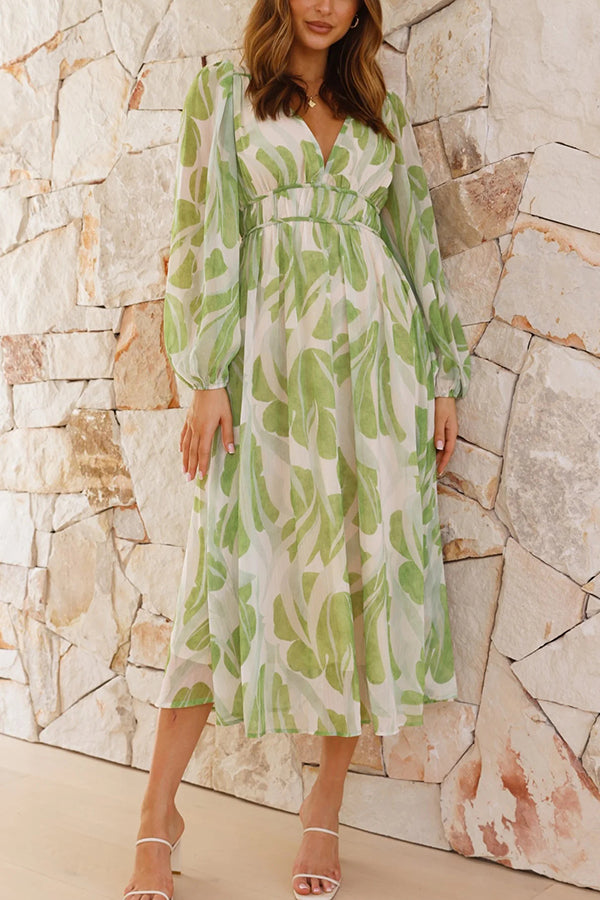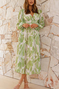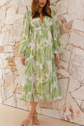 Unique Print Long Sleeve V-Neck Waist Midi Dress