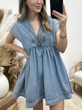 V Neck Lapel Cap Sleeve High Waist Denim Baby Doll Dress