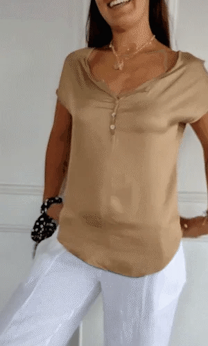 Embrace effortless elegance with our V-neck short-sleeved T-shirt, highlighted by a distinctively curved hem that accentuates your curves.