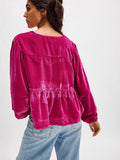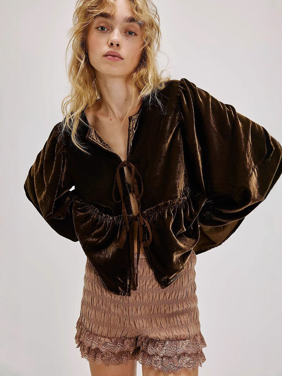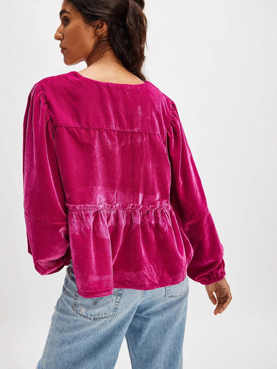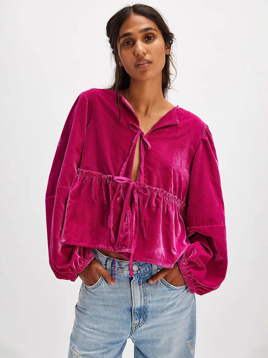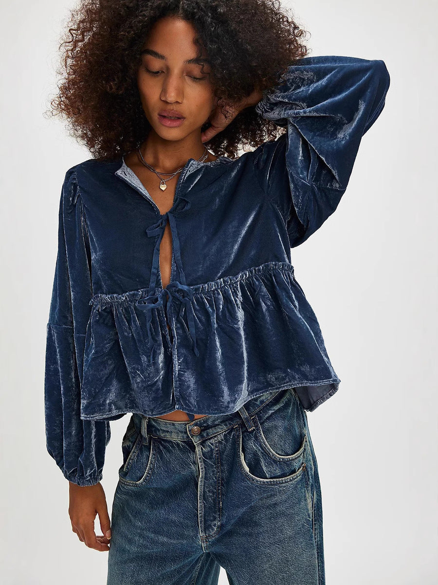 Velvet Blouse with Front Tie Details and Peplum Hem