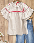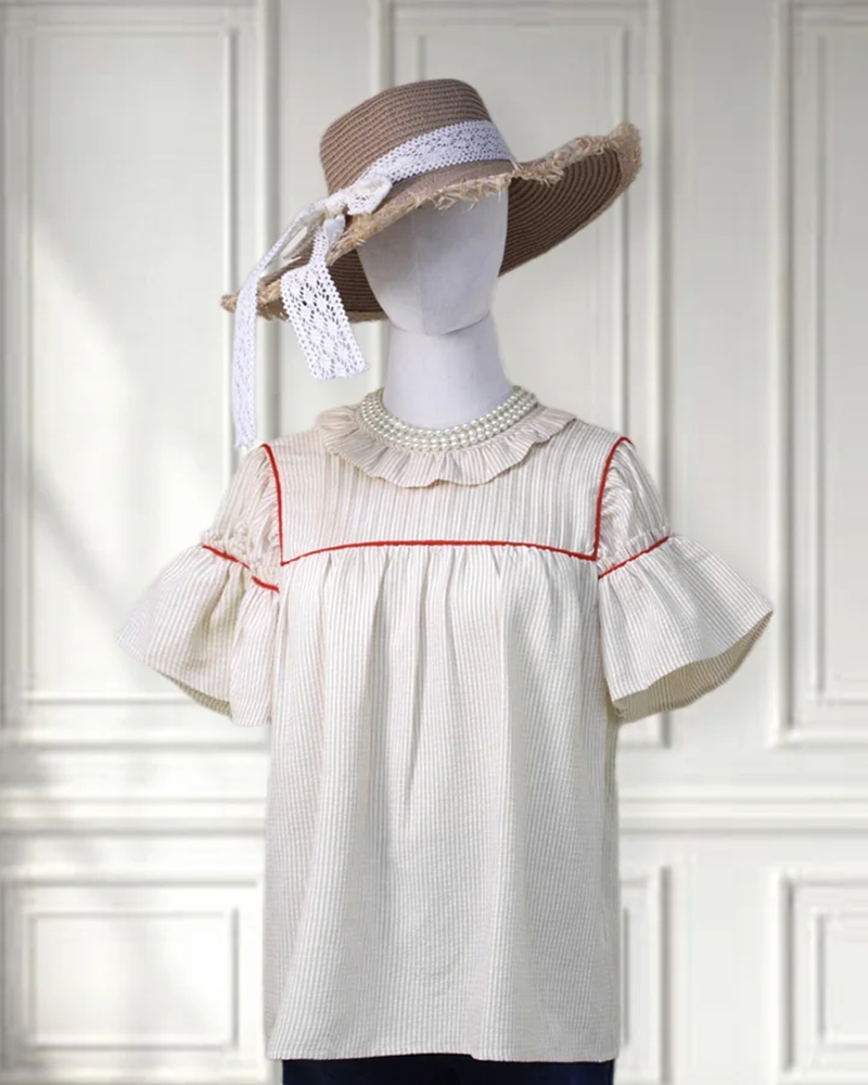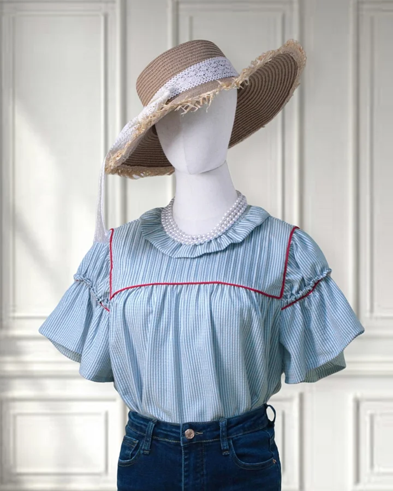 Introducing our Pretty Ruffled Trumpet Sleeve Blouse: Elevate your style with vertical stripes and charming trumpet sleeves, perfect for a chic and feminine look.
