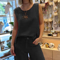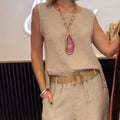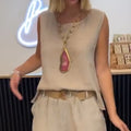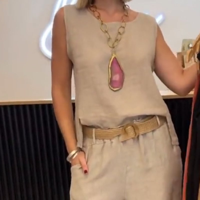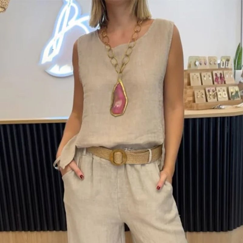 Sleeveless tops and wide-legged pants provide a modern, casual look that makes it easy to transition from casual travel to a relaxed office environment. A monochromatic pattern in beige or black adds a touch of elegance to any wardrobe.