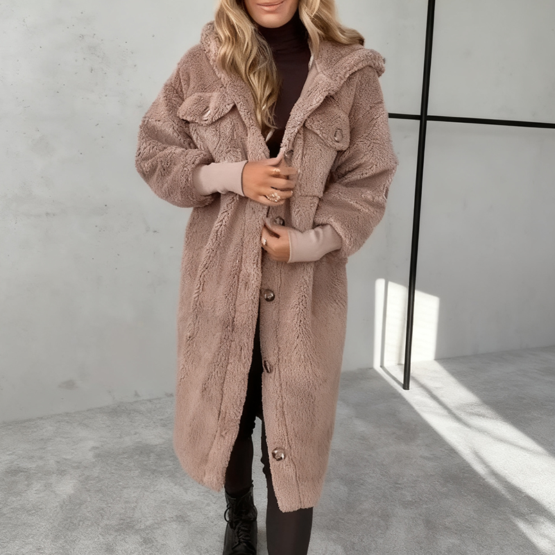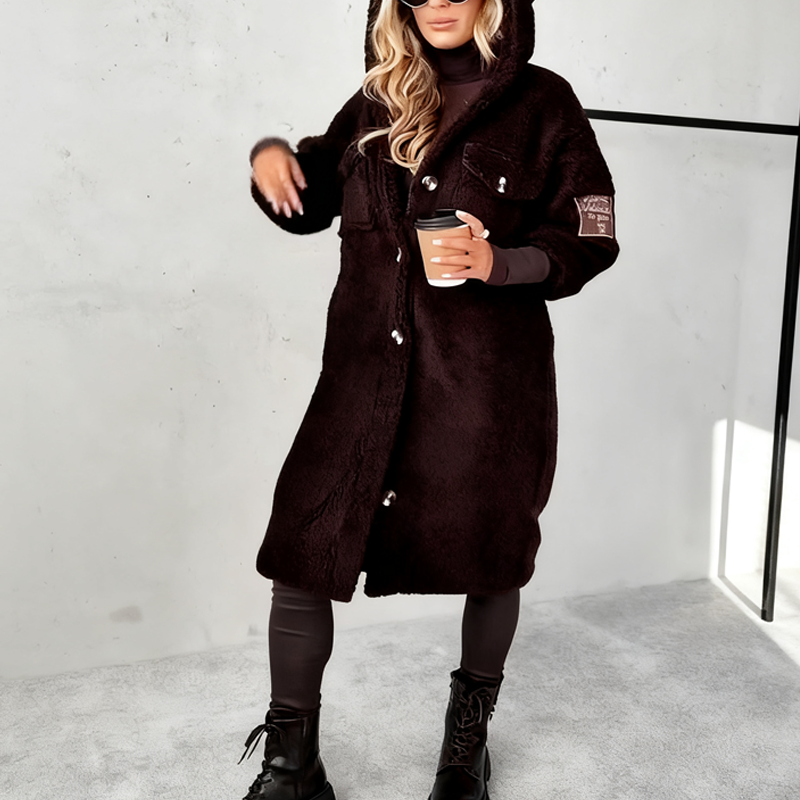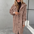 Women’s Button-Down Midi Fuzzy Coat with Hood