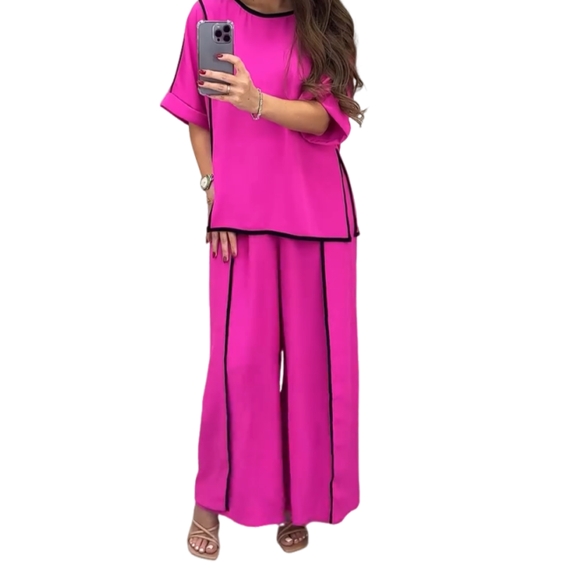 BLACK TRIM ACCENT - Featuring contrasting black trim on both the top and pants, this set adds a bold touch of style and sophistication, elevating your casual wardrobe with a pop of modern contrast.