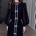 CHICK PATCHWORK DESIGN: Embrace a sophisticated look with a stylish black and white patchwork pattern and bow decor, adding elegance and structure to the dress while ensuring a polished appearance.