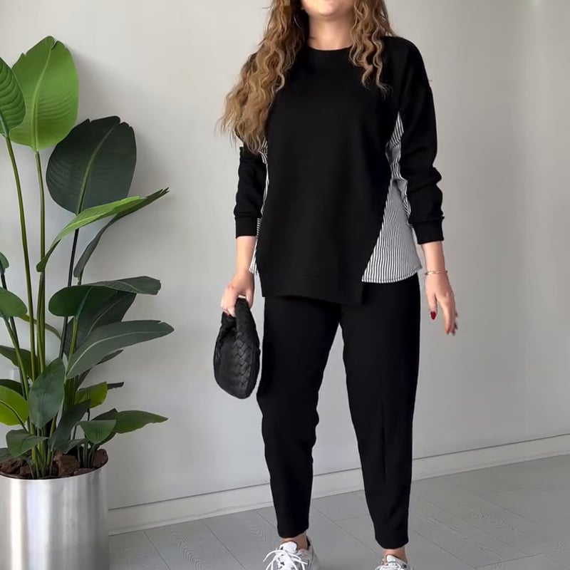 The Women's 2-Piece Color Block Lounge Set features a trendy design with contrasting stripes on the back, adding a bold touch to the classic lounge look. Made for comfort and style, this set is perfect for casual wear or lounging at home.