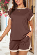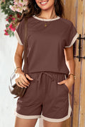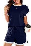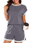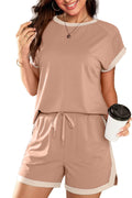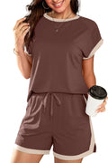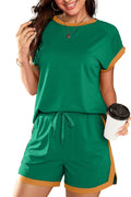 Indulge in the perfect blend of style and comfort with our Colorblock Short Sleeve Tops and Shorts Lounge Sets This versatile outfit features a stylish design with a round neck and a drawstring waist skort, offering a comfortable and flattering fit. Crafted in a vibrant summer color and made from soft, stretchy fabric, this set is ideal for any occasion – whether you're on vacation or simply lounging around. Elevate your summer wardrobe with this must-have ensemble!