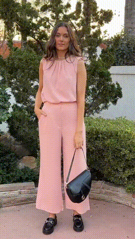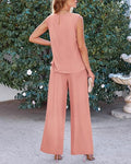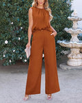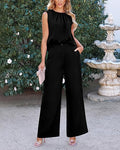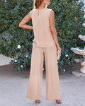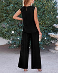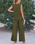 Ruched Design At Neckline Makes The Sleeveless Tops Trendy And Delicate. Women Tops With Back Button Is Convenient To Put On And Off. Elastic High Waisted Pants Bring You A Comfortable Fit, Wide Legs Provides Freedom Of Movement.