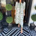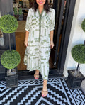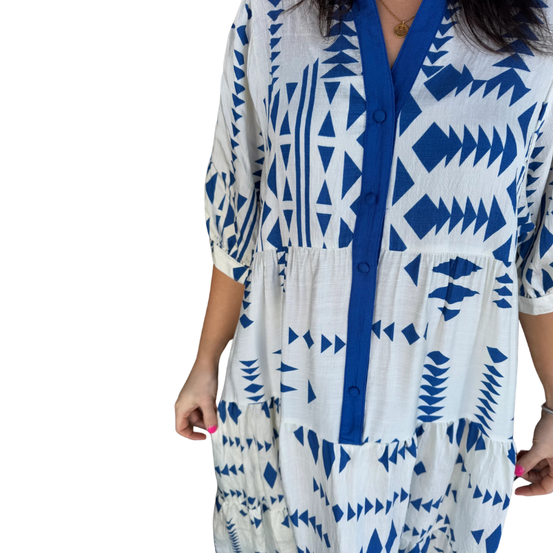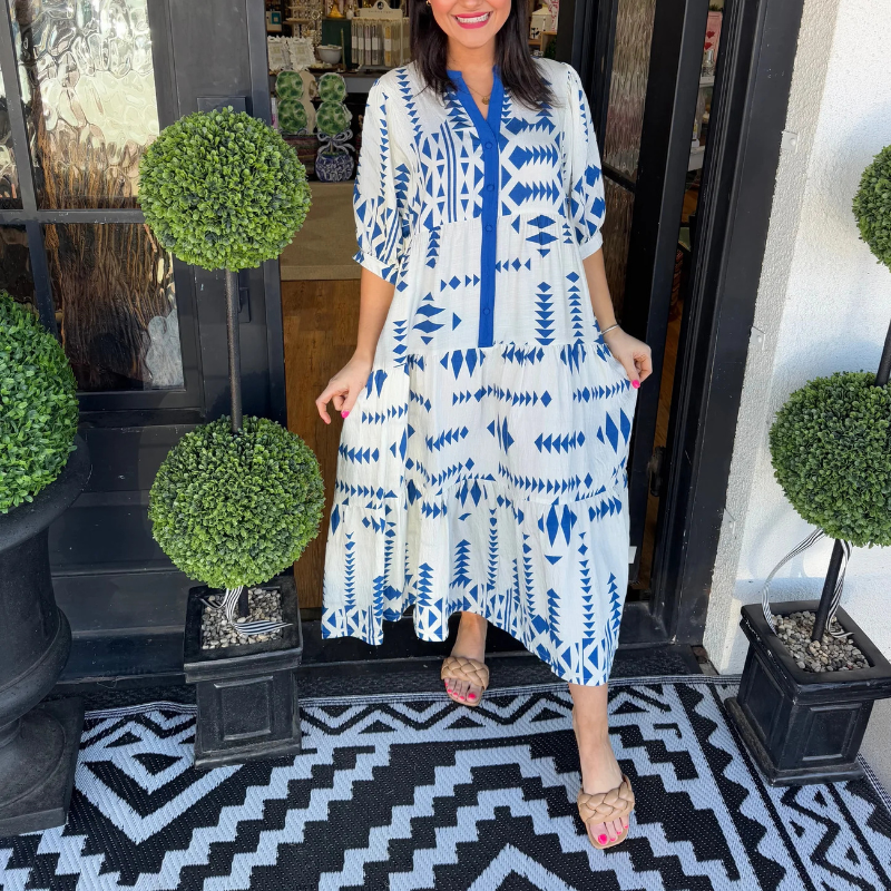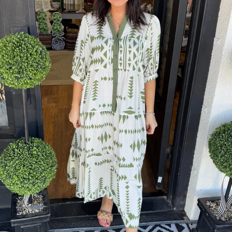Indulge in the finest of fashion with the Button V Neck Geometric Print Dress. Its maxi length exhibits elegance, while the soft hue and geometric pattern add a touch of sophistication. Elevate your style with this exclusive piece that radiates luxury and artistry.