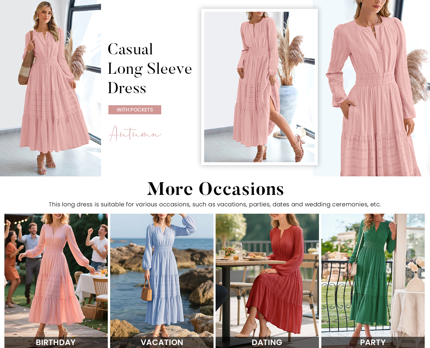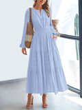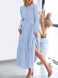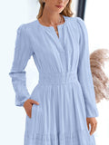 Women's Casual Long Sleeve V Neck Elastic Waist Lightweight Maxi Dress