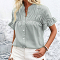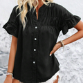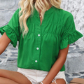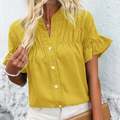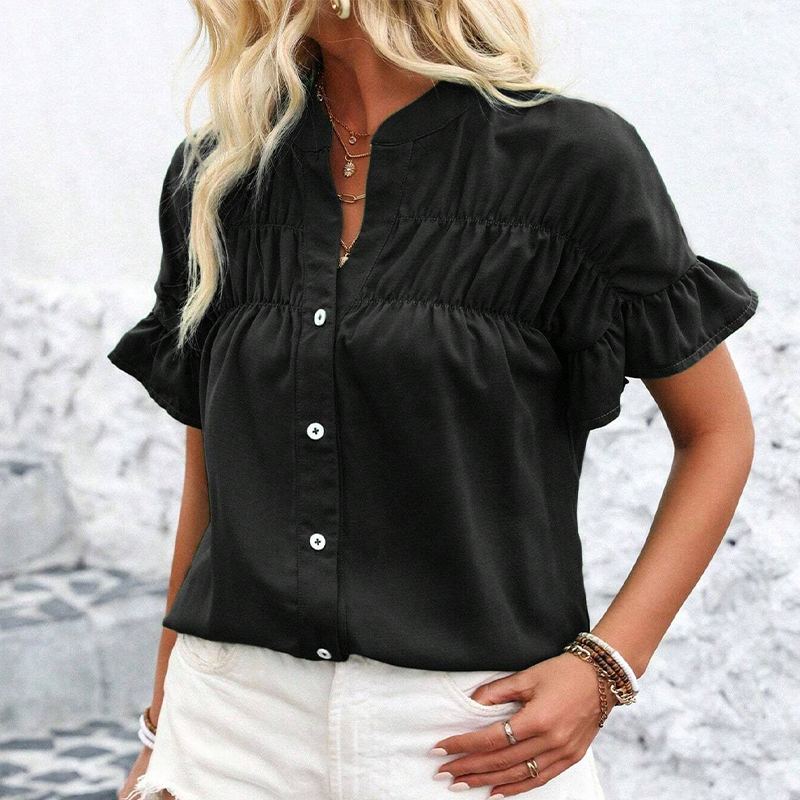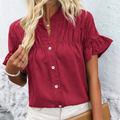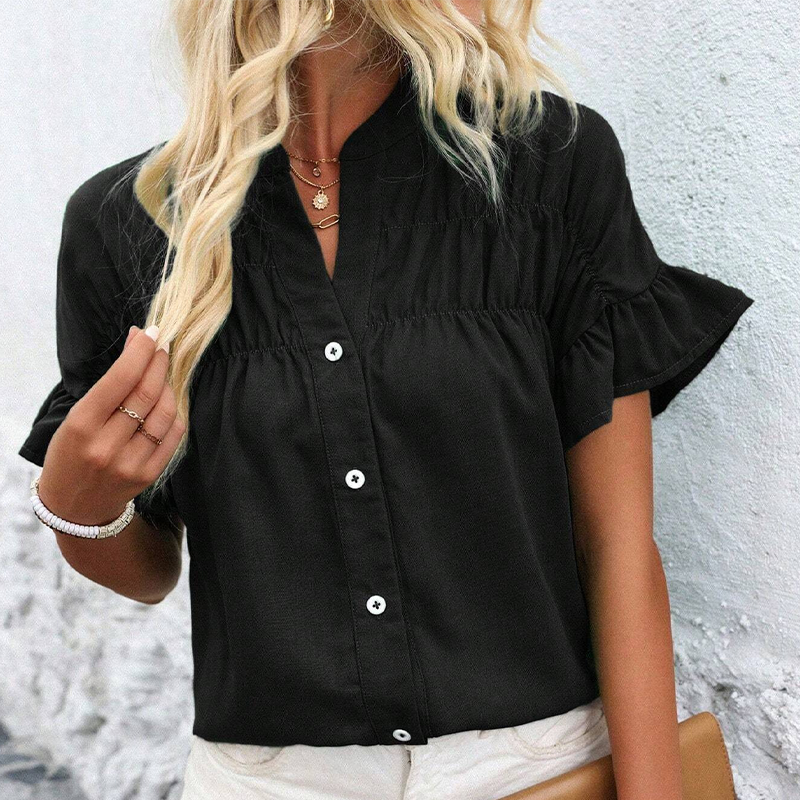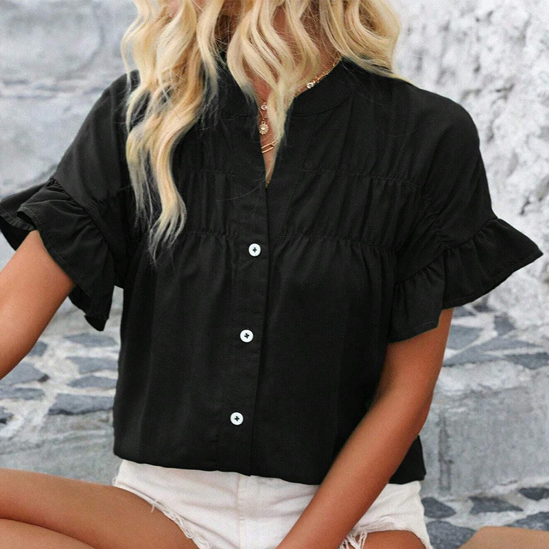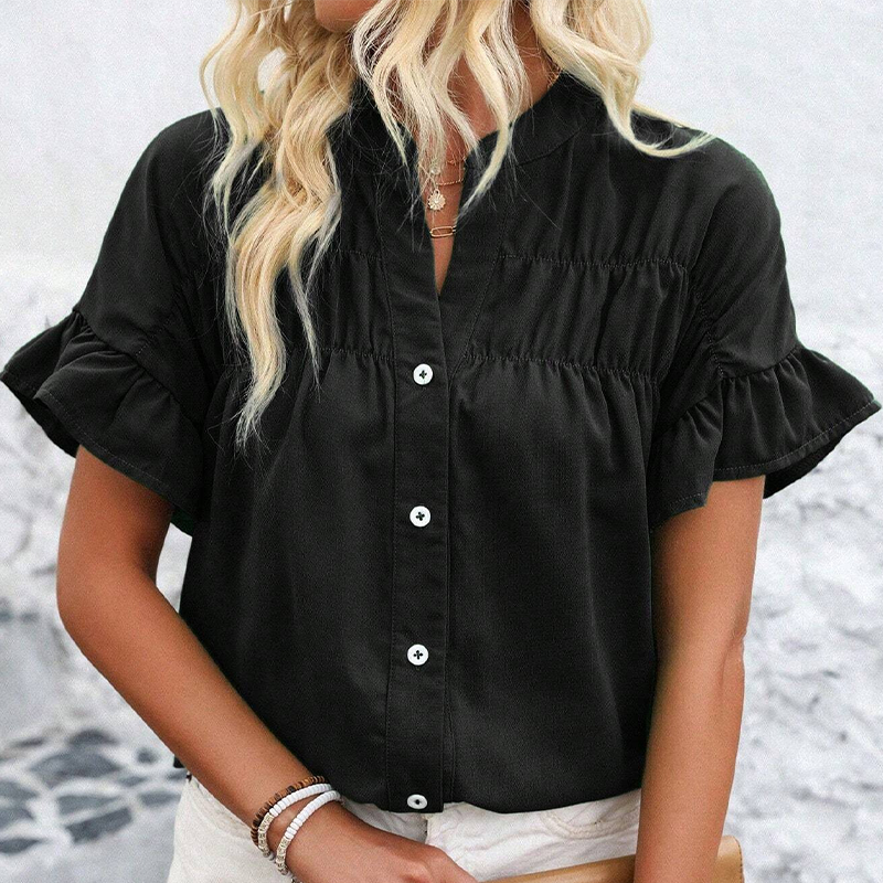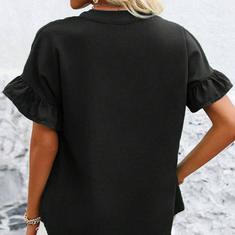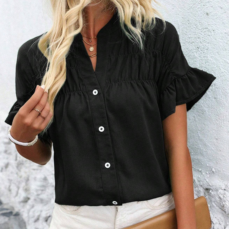 FLARE SHORT SLEEVES & LOOSE FIT- Designed with flared short sleeves, this top is refreshing and comfortable, perfect for summer. The ruffle detail adds an elegant touch, making it both stylish and practical.