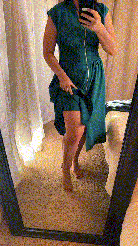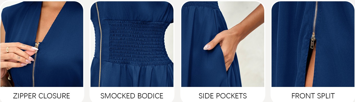 Zip into sophisticated chic style with our V Neck Zipper Front Smocked Waist Midi Dress. This dress is so good and perfect for summer! The smocked bodice adds stretch, while the front split brings a modern touch. The zipper closure ensures a secure and elegant fit