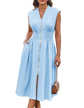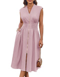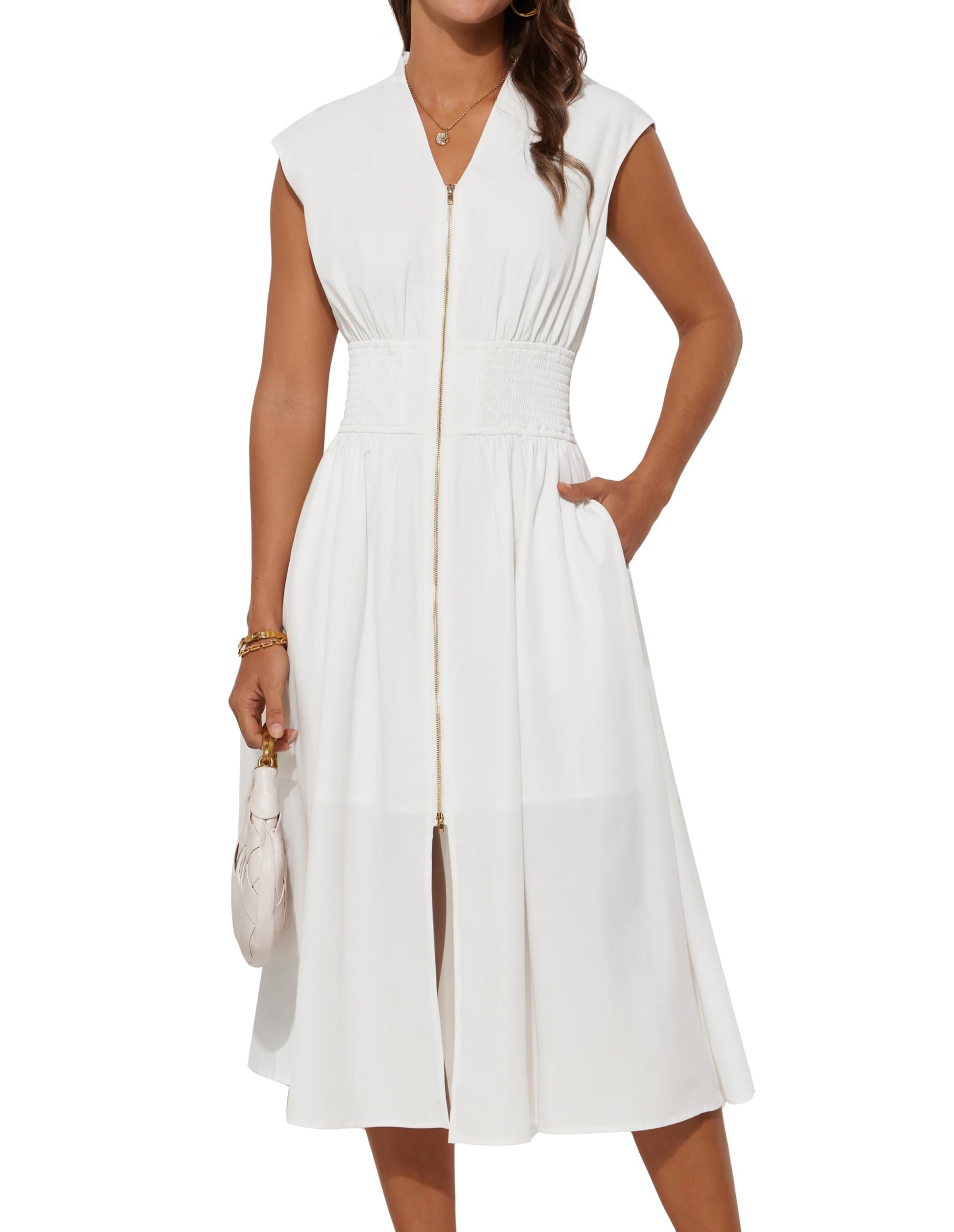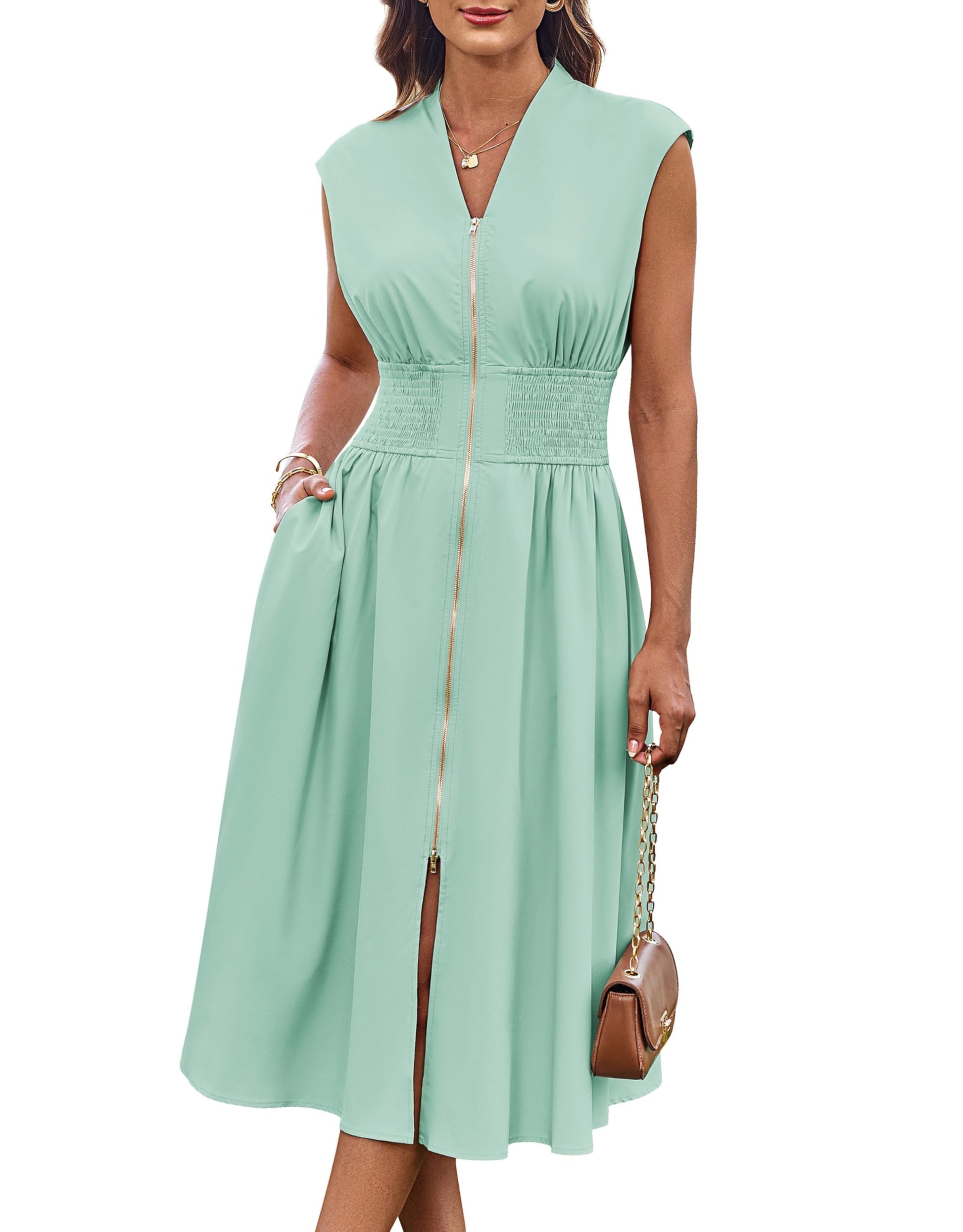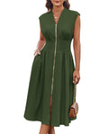 Women's Casual V Neck Cap Sleeve Zipper Front Flowy Dress with Pockets