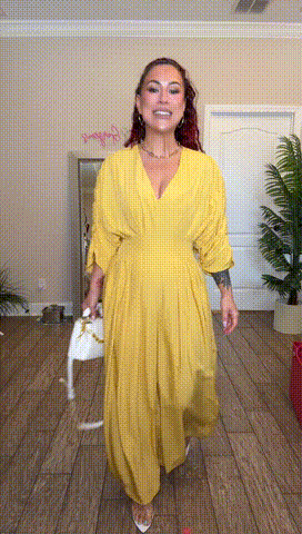 - Design Detail: V-neckline elongates the neck and adds subtle sensuality; pleated waist highlights natural curves.