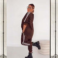 DRAWSTRING PANTS – The pants are enhanced with adjustable drawstrings and vertical side stripes. This combination not only provides a secure and adaptable fit but also adds a sporty element to the design. The vertical lines visually elongate the legs, creating a more flattering look while maintaining relaxed comfort. This detail brings balance between function and style in daily wear.