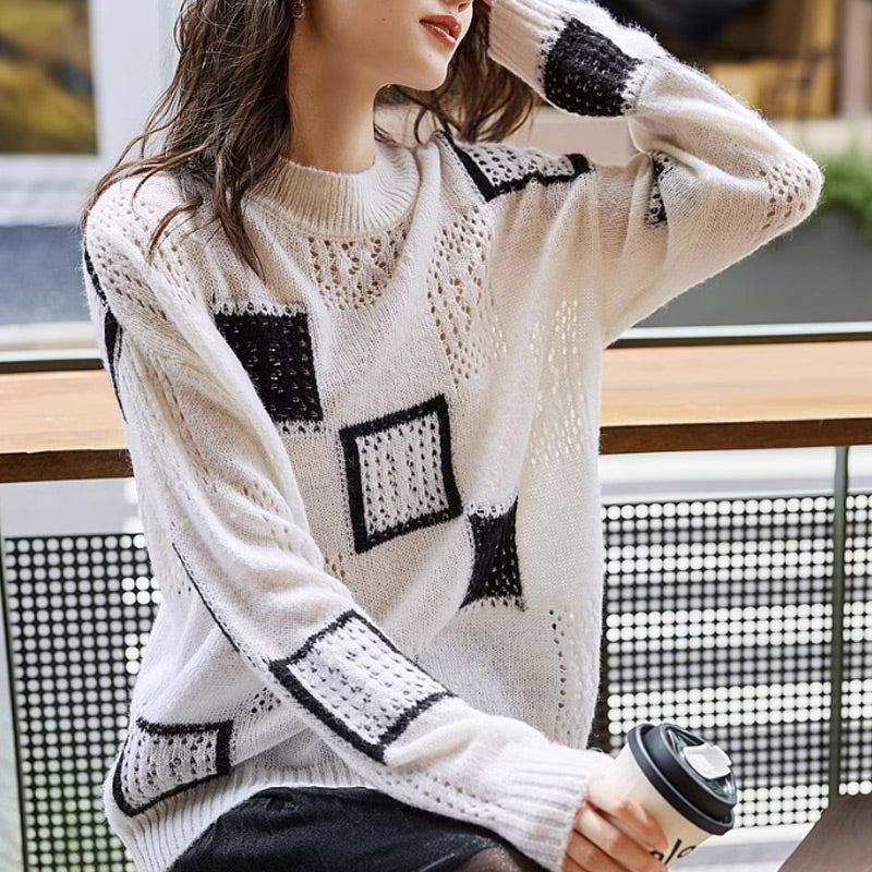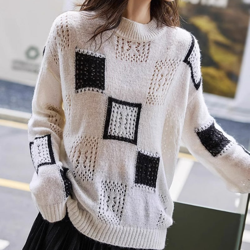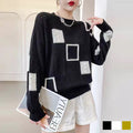 COLOR OPTIONS - Multiple Colors Available: Yellow Color Block Plaid Print Knitted Pullover Sweaters, White Color Block Plaid Print Knitted Pullover Sweaters, Black Color Block Plaid Print Knitted Pullover Sweaters.