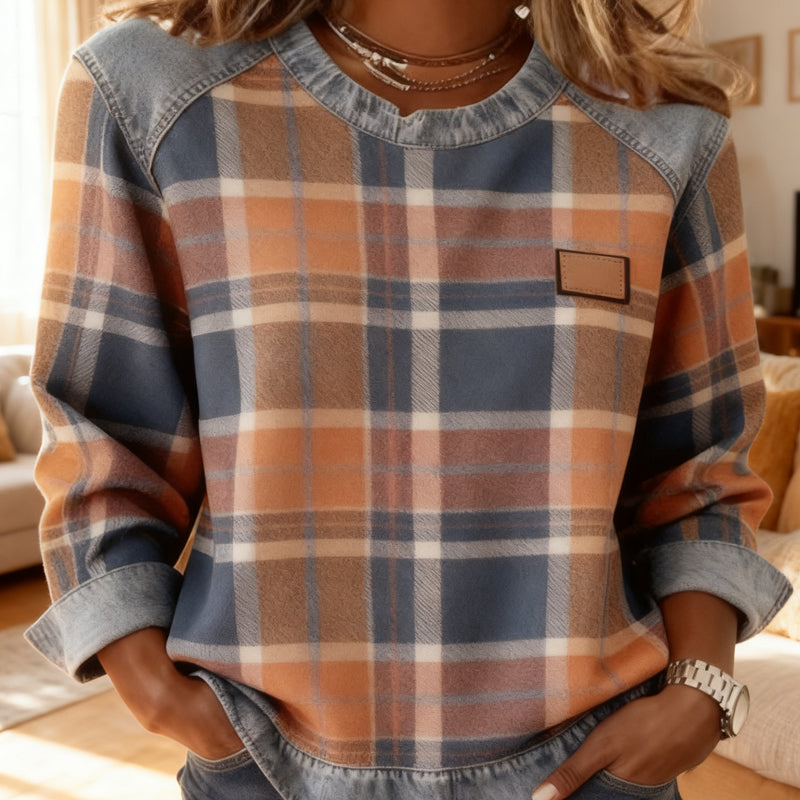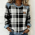 Women's Denim Patchwork Plaid Long-Sleeve Tops