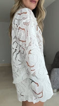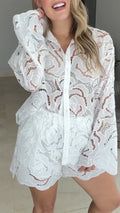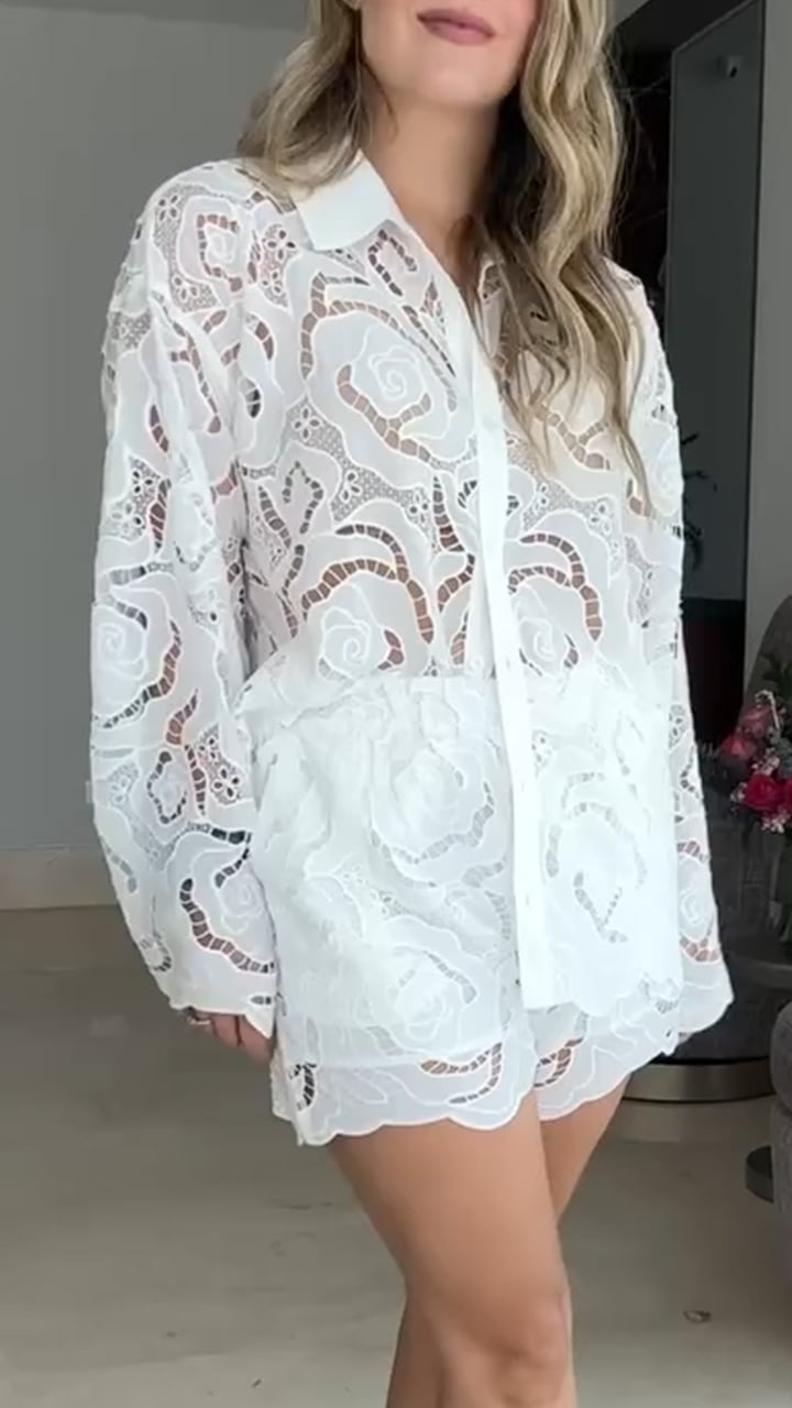 The long - sleeved shirt, adorned with intricate lace patterns, features a classic collar and button - down front. Its sheer panels delicately reveal hints of skin, adding an alluring touch. The matching shorts echo the shirt's lace motif, with scalloped hems that enhance the feminine aesthetic.