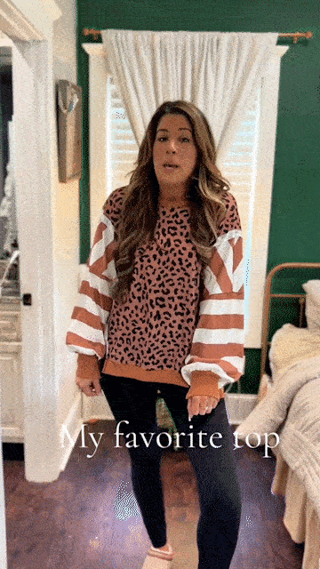 This trendy sweatshirt combines several chic elements is worth to have. It features a leopard silhouette with striped colorblock sleeves. ·Oversized fit with side slits are comfy to get a casual slim look.