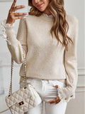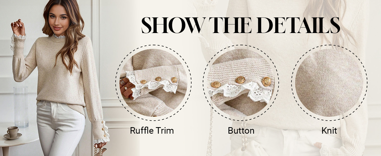 Elevate your autumn wardrobe with the sweater! This top features a classic round neck design, perfect for layering. The long sleeves offer warmth, while the lace trim adds a delicate touch. Ideal for autumn and winter, this sweater combines comfort with style. It's a must-have for your seasonal collection.