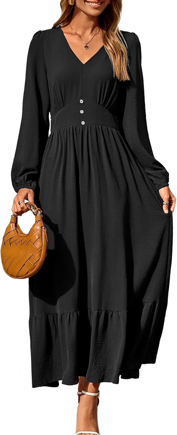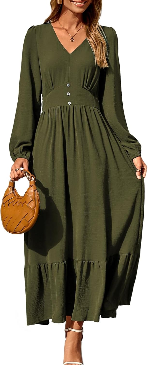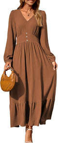 Womens Long Sleeve V Neck Elegant Casual Flowy Tiered Maxi Dresses