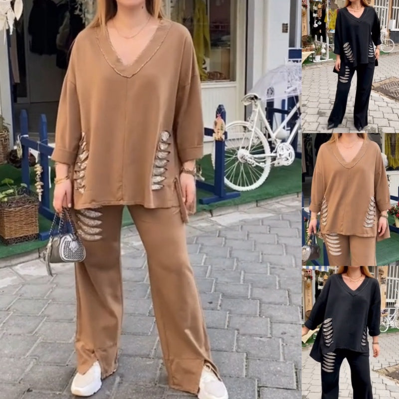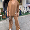 Women's Loose V-Neck Long Sleeve Top & Pants Two Piece Set