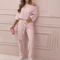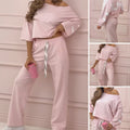 SMART DESIGN DETAILS - Thoughtful features elevate your everyday wear. The top's off-shoulder offers timeless style, while the pants' wide-leg cut and dual side pockets combine fashion with function. The coordinated set looks polished enough for casual outings yet comfortable enough for all-day wear.