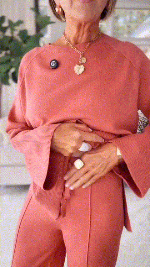 This soft knit lounge set is made for chill days, coffee runs, and lazy weekends. Loose fit, warm feel, and a relaxed vibe that still looks stylish. Can be dressed up with booties, down with sneakers, and can be worn as a set, or as separates. Effortless cozy and chic designs for a laidback, throw-on-and-go approach to dressing.