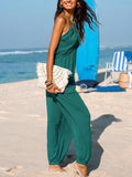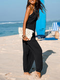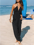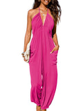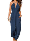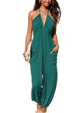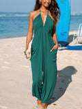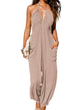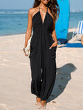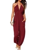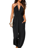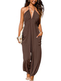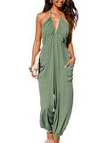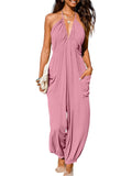 Women's Plunge Halter Sleeveless Pleated Jogger Maxi Jumpsuit with Pockets