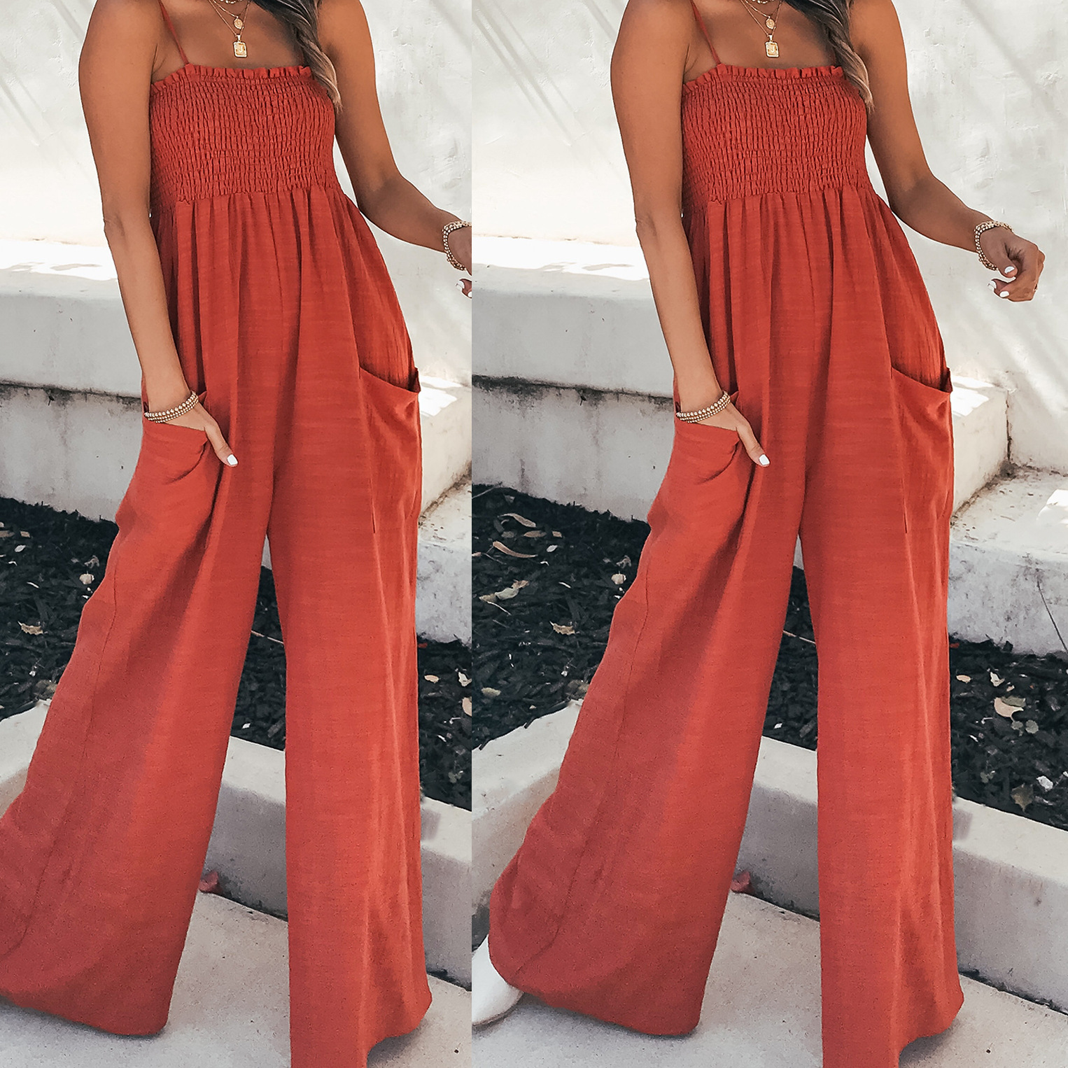 - Wide-leg jumpsuit featuring a smocked top with adjustable spaghetti straps and 2 large front pockets.