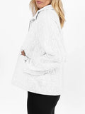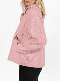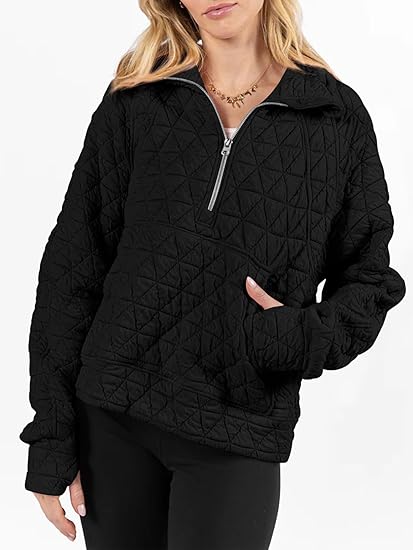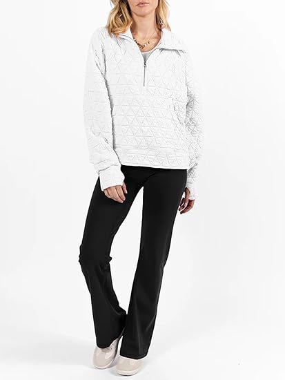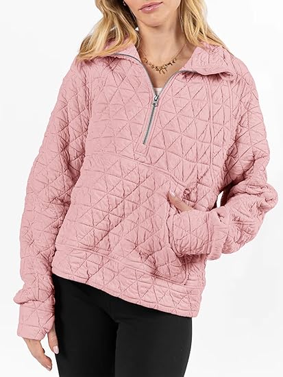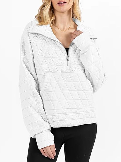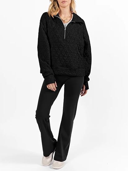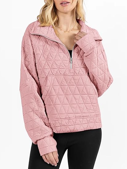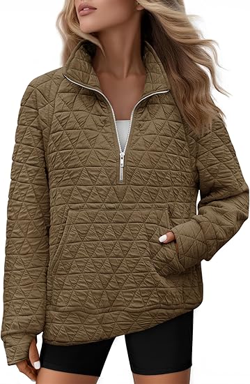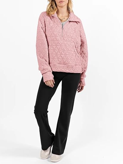 Women's Quilted Long Sleeve Quarter-Zip Pullover Sweatshirt with V-Neck Collar, Thumb Holes, and Front Pockets