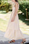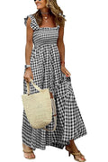 Women's Retro Plaid Smocked Dress Spaghetti Strap Flounce Long Dress With Pockets