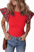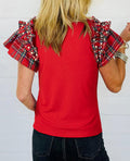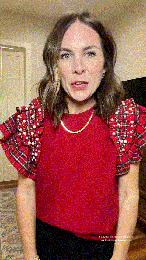 The cutest holiday top for the season. A relaxed fit classic red body with holiday plaid ruffle sleeves and pearl embellishment details. This is such a great top for any holiday festivity. Pair it with jeans for a casual statement, or dress it up with a skirt and heels for instant glam.