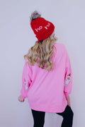Features a super soft pink jersey knit fabric, crew neck, full length sleeves with ribbed cuff, a ribbed banded hem, and red, white, pink, and silver sequin embellished Santa head patches adorning the front and sleeves.