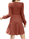 With its elegant square neckline and tiered skirt, this dress is the perfect blend of cozy and chic. The ribbed texture adds just the right amount of sophistication, while the long puffed sleeves and flattering fit make it ideal for any occasion.