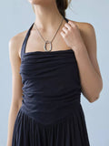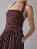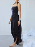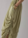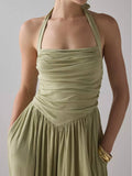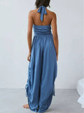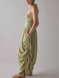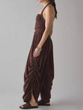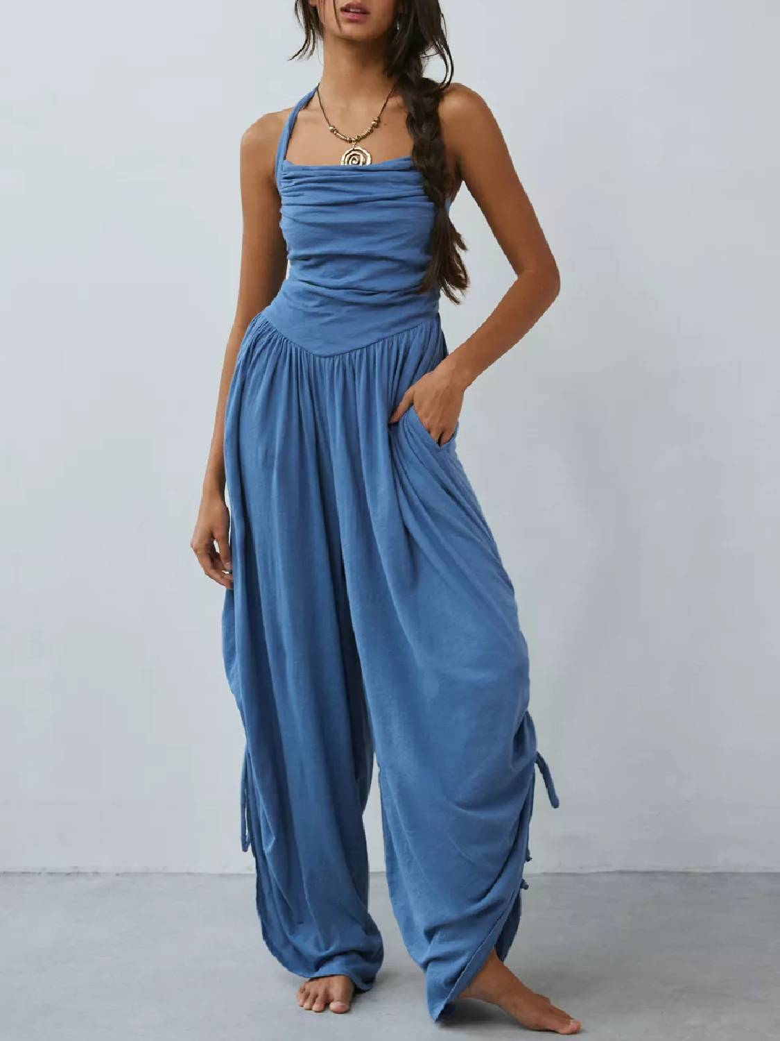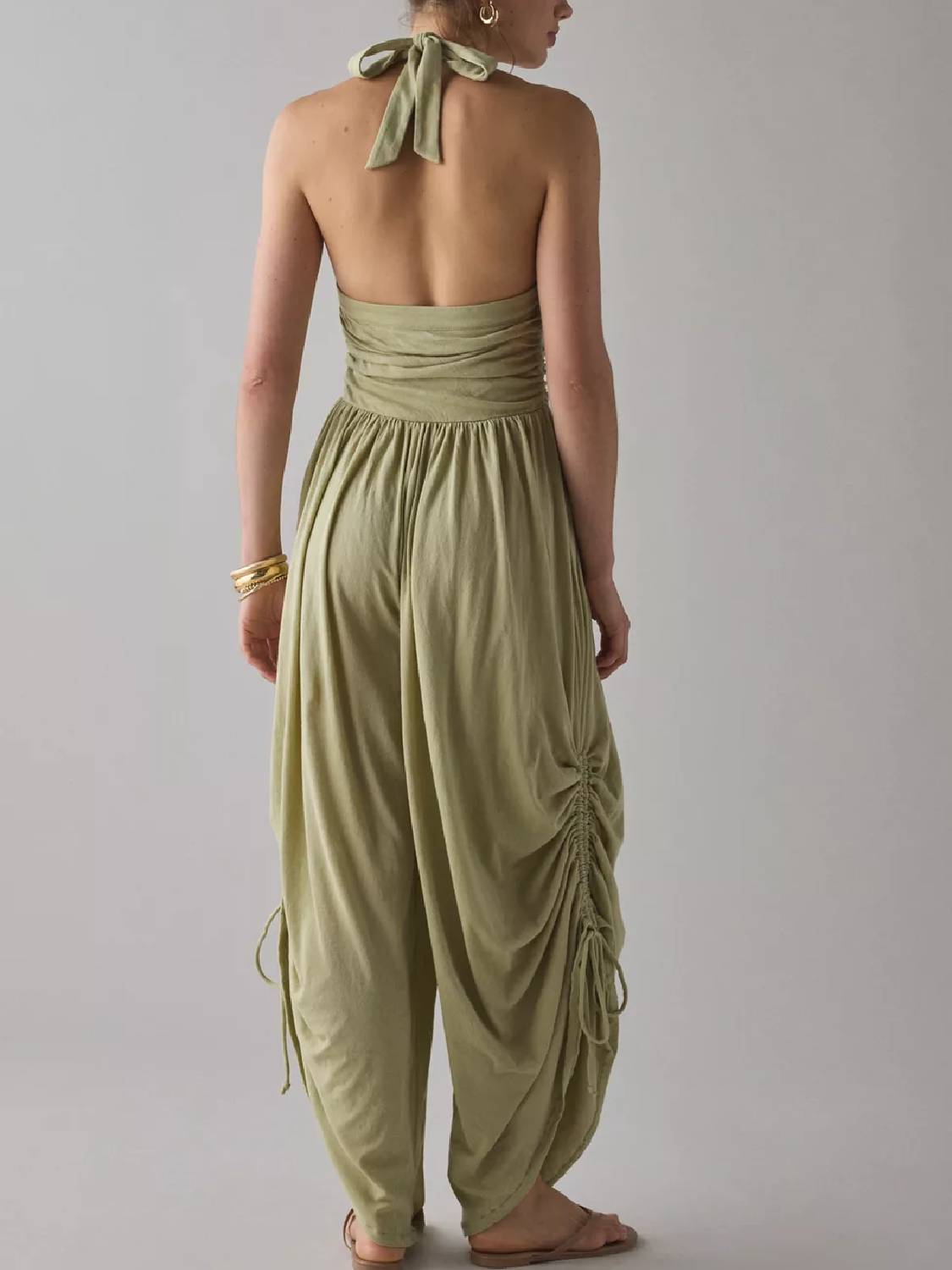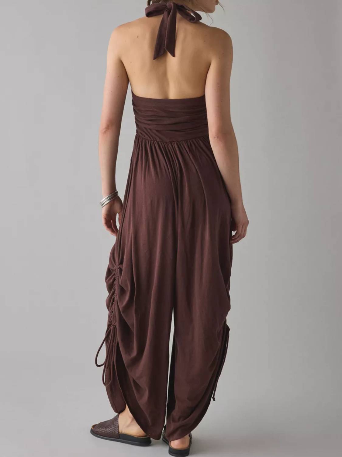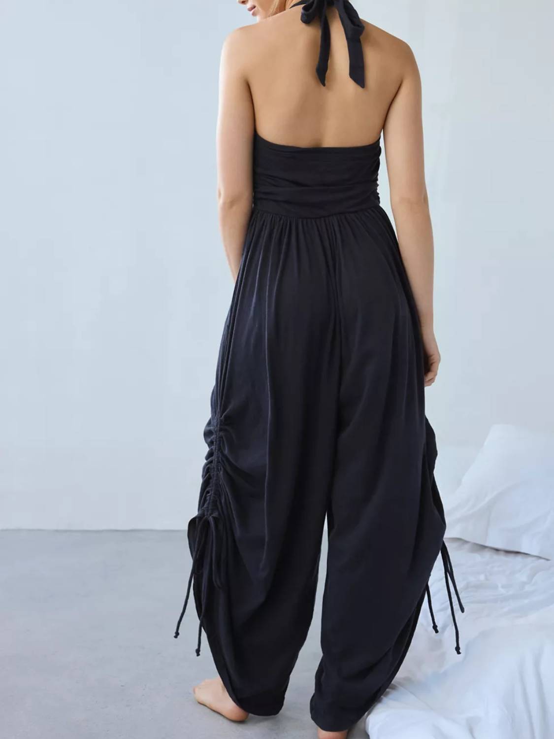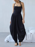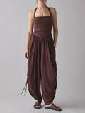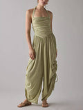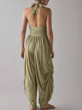 Womens Square Neckline Halter Straps Ruched Barrel Leg Jumpsuit